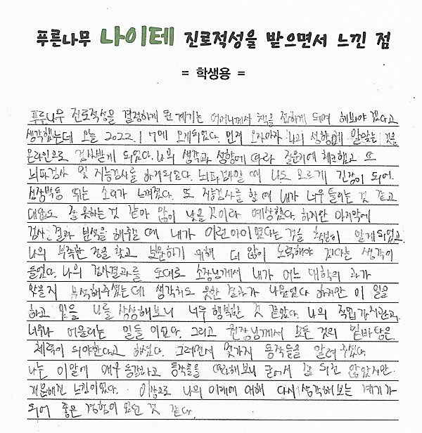 푸른나무 진로적성을 결정하게 된 계기는 어머니께서 책을 접하게 되며 해봐야 겠다고
