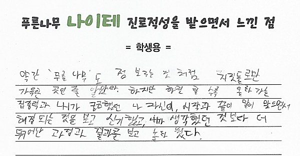 나이테 진로상담 후기(서울) 학생 페이지 정보 작성자 관리자 작성일22-03-04 11:12 조회4,224회 댓글0건 이전글 다음글 목록 본문 약간 '푸른나무'도 점보는 것 처럼 거짓들로만 가득한 곳인 줄 알았다. 하지만 하면 할 수록 올라가는 집중력과 내가 궁금했던 나 자신이, 시작과 끝이 말이 맞으면서 해결되는 것을 보고 신기했고, 내가 생각했던 것보다 더 뛰어난 과정과 결과를 보고 놀라웠다. 댓글목록 등록된 댓글이 없습니다. 이전글 다음글 목록
