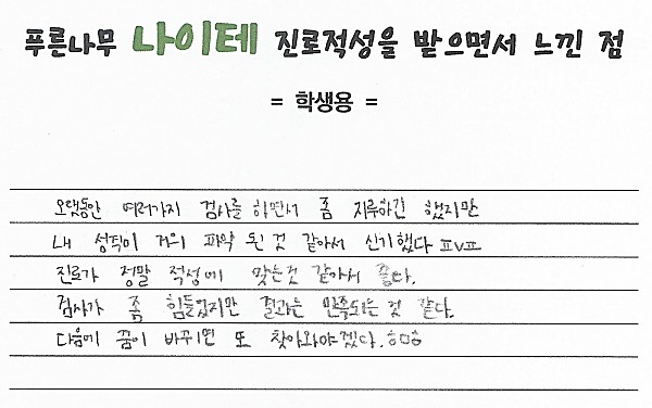 나이테 진로상담 후기(서울) 학생 페이지 정보 작성자 관리자 작성일22-03-04 11:19 조회4,187회 댓글0건 이전글 다음글 목록 본문 오랫동안 여러가지 검사를 하면서 좀 지루하긴 했지만 내 성격이 거의 파악 된 것 같아서 신기했다. ㅍ^ㅍ 진로가 정말 적성에 맞는 것 같아서 좋다. 검사가 좀 힘들었지만 결과는 만족되는 것 같다. 다음에 꿈이 바뀌면 또 찾아와야겠다. ㅎㅁㅎ 댓글목록 등록된 댓글이 없습니다. 이전글 다음글 목록