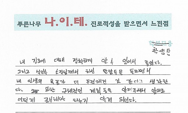 나이테 진로상담 후기(포항) 학생 페이지 정보 작성자 관리자 작성일21-10-04 16:54 조회4,586회 댓글0건 이전글 다음글 목록 본문 내 진로에 대해 정확하게 알 수 있어서 좋았다. 그리고 석인수 소장님께서 하신 말씀들을 들으면서 내 인생의 목표가 더 뚜렷해진 것 같다고 생각한 다. 또한 구체적인 계획등을 알려주셔서 앞으로 어떻게 공부해야 하는지 알게 되었다. 댓글목록 등록된 댓글이 없습니다. 이전글 다음글 목록