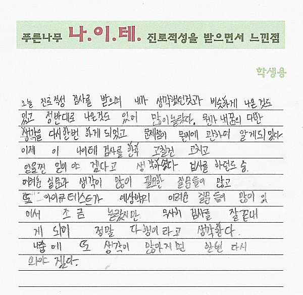 오늘 진로적성 검사를 받으며 내가 생각했던 것과 비슷하게 나온 것도