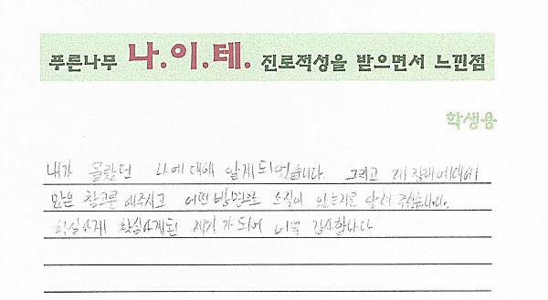 나이테 진로상담 후기(서울) 학생 페이지 정보 작성자 관리자 작성일21-08-06 14:24 조회4,582회 댓글0건 이전글 다음글 목록 본문 내가 몰랐던 나에 대해 알게 되었습니다. 그리고 제 장래에 대해 많은 참고를 해주시고 어떤 방면으로 소질이 있는지를 알려주셨습니다. 확실하게 확신하게 된 계기가 되어 너무 감사합니다. 댓글목록 등록된 댓글이 없습니다. 이전글 다음글 목록