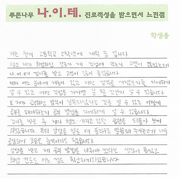 나.이.테 검사를 받고 고민이 많이 줄었습니다.