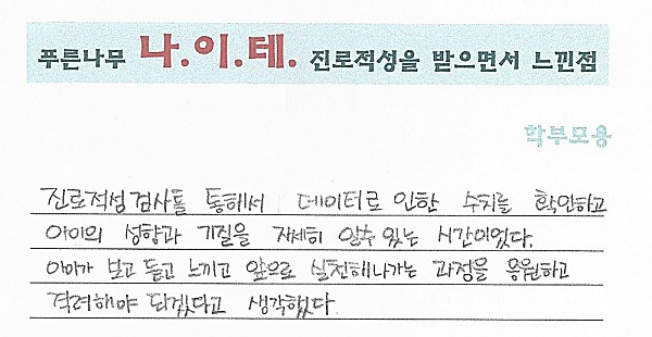 나이테 진로상담 후기(서울) 부모님 페이지 정보 작성자 관리자 작성일20-07-11 15:13 조회4,810회 댓글0건 이전글 다음글 목록 본문 진로적성검사를 통해서 데이터로 인한 수치를 확인하고 아이의 성향과 기질을 자세히 알 수 있는 시간이었다. 아이가 보고 듣고 느끼고 앞으로 실천해나가는 과정을 응원하고 격력해야 되겠다고 생각했다. 댓글목록 등록된 댓글이 없습니다. 이전글 다음글 목록