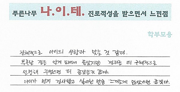나이테 진로상담 후기(화성시, 고1) 부모님 페이지 정보 작성자 관리자 작성일20-07-11 15:16 조회4,690회 댓글0건 이전글 다음글 목록 본문 전체적으로 아이의 성향과 맞는 것 같다. 부족한 점을 알게 되어서 좋았지만 결과를 더 구체적으로 설명해 주셨으면 더 좋았을 것 같다. 아이가 먼저 검사받고 싶어한 만큼 느끼는게 많았으면 좋겠다. 댓글목록 등록된 댓글이 없습니다. 이전글 다음글 목록