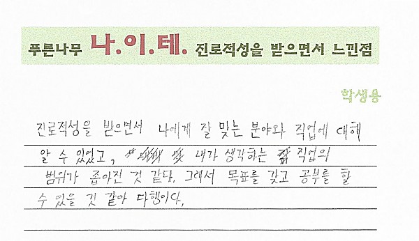 나이테 진로상담 후기(서울, 중2) 학생 페이지 정보 작성자 관리자 작성일20-02-26 14:03 조회4,693회 댓글0건 이전글 다음글 목록 본문 진로적성을 받으면서 나에게 잘 맞는 분야와 직업에 대해 알 수 있었고, 내가 생각하는 직업의 범위가 좁아진 것 같다. 그래서 목표를 갖고 공부를 할 수 있을 것 같아 다행이다. 댓글목록 등록된 댓글이 없습니다. 이전글 다음글 목록
