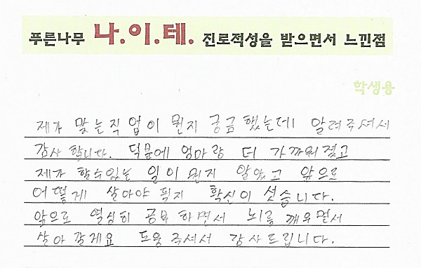 나이테 진로상담 후기(대구, 중 검정고시) 학생 페이지 정보 작성자 관리자 작성일19-11-22 15:50 조회5,393회 댓글0건 이전글 다음글 목록 본문 제가 맞는 직업이 뭔지 궁금했는데 알려주셔서 감사합니다. 덕분에 엄마랑 더 가까워졌고 제가 할 수 있는 일이 뭔지 알았고 앞으로 어떻게 살아야 될지 확신이 섰습니다. 앞으로 열심히 공부하면서 뇌를 깨우면서 살아갈게요. 도움주셔서 감사드립니다. 댓글목록 등록된 댓글이 없습니다. 이전글 다음글 목록