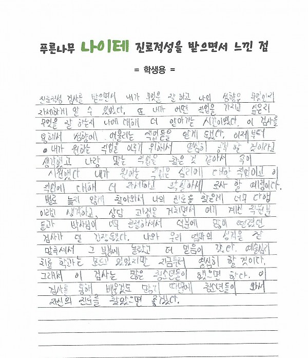 진로적성검사를 받으면서 내가 무엇을 잘하고 나의 성향은 무엇인지 자세하게 알 수 있었다. 또 내가 어떤 직업을 가지고 싶은지 무엇을 잘 하는지 나에 대해 더 알아가는 시간이었다. 이 검사를 통해서 성향에 어울리는 직업들을 알게 되었다. 이제부터 내가 원하는 직업을 이루기 위해서 열심히 공부 할 것이라고 생각했고, 나랑 맞는 직업을 찾은 것 같아서 속이 시원했다. 내가 원하는 직업은 심리에 대한 직업이고 이 직업에 대햇 더 자세하고 확실하게 조사할 예정이다. 별로 늦지 않게 찾아와서 나의 진로를 찾은게 너무 다행이라고 생각하고, 상담 과정을 거치면서 여기 계신 직원분들과 박사님이 너무 친절하셔서 덕분에 많이 떨렸던 검사가 덜 긴장되었다. 나와 우리 엄마의 성격을 잘 맞추셔서 그 부분에 놀랐고 더 믿음이 갔다. 예술심리 치료 학과는 모르고 있었지만 지금부터 열심히 할 것이다. 그래서 이 검사는 많은 청소년들이 했으면 한다. 이 검사를 통해 배운 것도 많기 때문에 청소년들이 와서 진로를 찾았으면 좋겠다.
