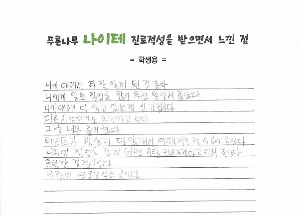 나이테진로상담후기 (서울) 학생 페이지 정보 작성자 관리자 작성일24-03-02 14:35 조회2,448회 댓글0건 이전글 다음글 목록 본문 나에 대해서 더 잘 알게 된 것 같다. 나에게 맞는 직업을 많이 추천 받아서 좋았다. 나에 대해 다 알고 있는게 신기했다. 다른 사람에게도 추천하고 싶다. 그냥 즐거웠다. 테스트가 괸장히 다양해거 여러가지를 할 수 있어 좋았다. 나중에 직업을 갖게 되면 사람 보내주겠다고 해서 좋았다. 특별한 경험이었다. 나중에 또 오고 싶은 곳이다. 댓글목록 등록된 댓글이 없습니다. 이전글 다음글 목록