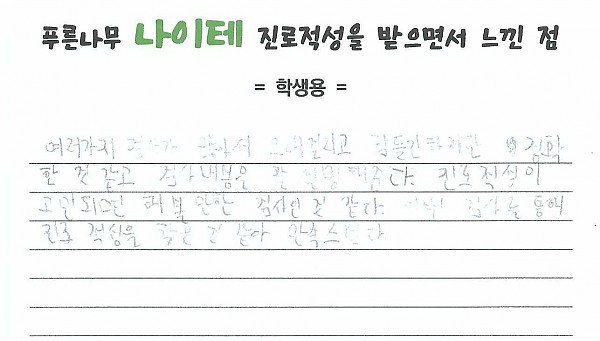 나이테진로상담후기 (경기도) 학생 페이지 정보 작성자 관리자 작성일24-03-04 16:11 조회2,437회 댓글0건 이전글 다음글 목록 본문 여러가지 검사가 많아서 오래 걸리고 힘들긴 하지만 정확한 것 같고, 검사내용을 잘 설명 해준다. 진로적성이 고민되면 해 볼 만한 검사인 것 같다. 이번 검사를 통해 진로적성을 찾은 것 같아 만족스럽다. 댓글목록 등록된 댓글이 없습니다. 이전글 다음글 목록