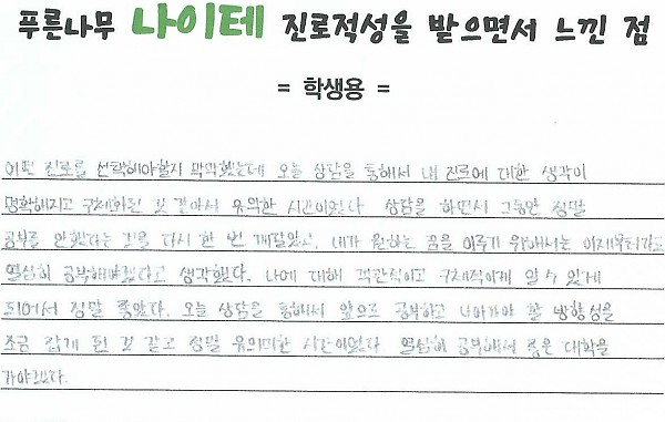 어떤 진로를 선택해야할지 막막했는데 오늘 상담을 통해서 내 진로에 대한 생각이 명확해지고 구체화된 것 같아서 유익한 시간이었다. 상담을 하면서 그동안 정말 공부를 안했다는 것을 다시 한 번 깨달았고, 내가 원하는 꿈을 이루기 위해서는 이제부터라도 열심히 공부해야겠다고 생각했다. 나에 대해 객관적이고 구체적이게 알 수 있게 되어서 정말 좋았다. 오늘 상담을 통해서 앞으로 공부하고 나아가야 할 방향성을 조금 잡게 된 것 같고 정말 유의미한 시간이었다. 열심히 공부해서 좋은 대학을 가야겠다.
