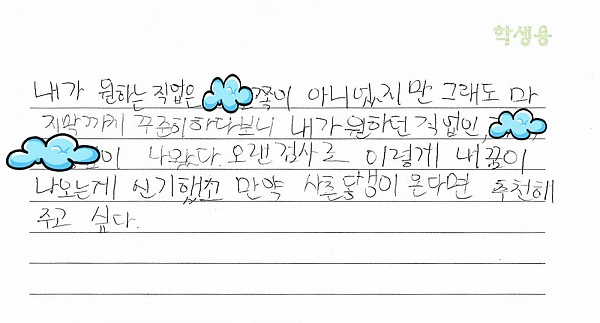 나이테 진로상담 후기(서울) - 학생 페이지 정보 작성자 관리자 작성일19-03-05 16:07 조회5,398회 댓글0건 이전글 다음글 목록 본문 내가 원하는 직업은 @@쪽이 아니었지만 그래도 마 지막까지 꾸준히 하다보니 내가 원하던 직업인 @@, @@이 나왔다. 오랜 검사로 이렇게 내 꿈이 나오는게 신기했고 만약 사촌동생이 온다면 추천해 주고 싶다. 댓글목록 등록된 댓글이 없습니다. 이전글 다음글 목록