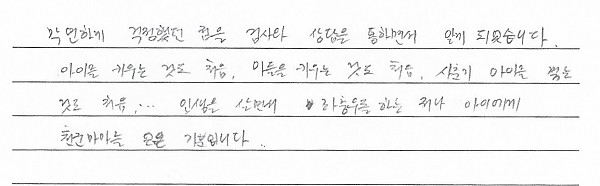 나이테 진로상담 후기(서울, 중) 페이지 정보 작성자 관리자 작성일19-01-18 15:28 조회5,273회 댓글0건 이전글 다음글 목록 본문 막연하게 걱정했던 점을 검사와 상담을 통함녀서 알게 되었습니다. 아이를 키우는 것도 처음, 아들 키우는 것도 처음, 사춘기 아이를 맞는 것도 처음... 인생을 살면서 좌충우돌 하는 저나 아이에게 천군만마를 얻은 기분입니다. 댓글목록 등록된 댓글이 없습니다. 이전글 다음글 목록