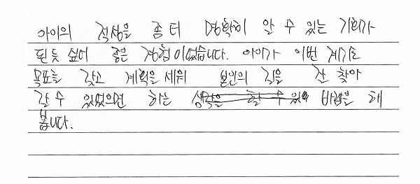 나이테 진로상담 후기(서울, 중) 페이지 정보 작성자 관리자 작성일19-01-25 15:52 조회5,397회 댓글0건 이전글 다음글 목록 본문 아이의 적성을 좀 더 명확히 알 수 있는 기회가 된 긋 싶어 좋은 경험이었습니다. 아이가 이번 계기로 목표를 갖고 계획을 세워 본인의 길을 잘 찾아 갈 수 있었으면 하는 바램을 해 봅니다. 댓글목록 등록된 댓글이 없습니다. 이전글 다음글 목록