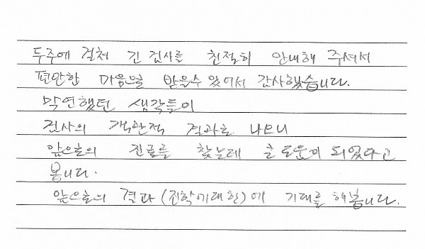 나이테 진로상담 후기(용인, 고) 페이지 정보 작성자 관리자 작성일19-01-17 14:58 조회5,430회 댓글0건 이전글 다음글 목록 본문 2주에 걸쳐 긴 검사를 친절히 안내해 주셔서 편안한 마음으로 받을 수 있어서 감사했습니다. 막연했던 생각들이 검사의 객관적 결과로 나오니 앞으로의 진로를 찾는데 큰 도움이 되었다고 봅니다. 앞으로의 결과(진학에 대한)에 기대를 해봅니다. 댓글목록 등록된 댓글이 없습니다. 이전글 다음글 목록