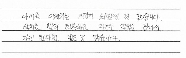나이테 진로상담 후기(부산, 고) 페이지 정보 작성자 관리자 작성일19-01-07 11:43 조회5,881회 댓글0건 이전글 다음글 목록 본문 아이를 이해하는 시간이 되었던 것 같습니다. 상처를 빨리 회복하고 자기의 적성을 찾아서 가게 된다면 좋을 것 같습니다. 댓글목록 등록된 댓글이 없습니다. 이전글 다음글 목록