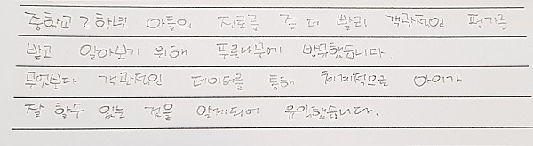 나이테 진로상담 후기(인천, 중) 페이지 정보 작성자 관리자 작성일18-12-10 11:57 조회5,867회 댓글0건 이전글 다음글 목록 본문 중하교 2학년 아들의 진로를 좀 더 빨리 객관적인 평가를 받고 알아보기 위해 푸른나무에 방문했습니다. 무엇보다 객관적인 데이터를 통해 체계적으로 아이가 잘 할 수 있는 것을 알게되어 유익했습니다. 댓글목록 등록된 댓글이 없습니다. 이전글 다음글 목록