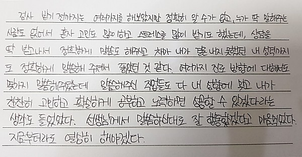 딱 받고나서 정확하게 말씀도 해주시고 차마 내가 결론내지 못했던 내 성격까지