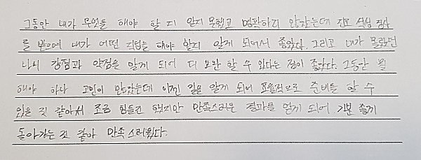나의 강점과 약점을 알게 되어 더 보완할 수 있다는 점이 좋았다. 그동안 뭘