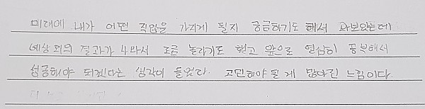나이테 진로상담 후기(서울, 중) 페이지 정보 작성자 관리자 작성일18-08-29 19:12 조회5,604회 댓글0건 이전글 다음글 목록 본문 미래에 내가 어떤 직업을 가지게 될지 궁금하기도 해서 와보았는데 예상외의 결과가 나와서 조금 놀라기도 했고 앞으로 열심히 공부해서 성공해야 되겠다고 생각이 들었다. 고민해야 될 게 많아진 느낌이다. 댓글목록 등록된 댓글이 없습니다. 이전글 다음글 목록