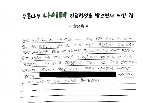 진로 적성을 받으면서 내 성격과 내가 잘하는 것과 못하는 것에 대해 많이 알게 되었고, 그것에 맞는 학과나 직업을 추천받았다. 물론 성적에 맞춰 가야하지만 최소한 어느 정도까지 올려야 하는지에 대해 가늠할 수 있게 되었다. 전날 잠을 제대로 못자고 와서 지능검사할 때 약간 힘들었지만 전체적으로 오래걸렸어도 그만큼 많은 정보를 얻게 되어서 다행이다. 알려주신 학습법 사용해서 열심히 공부하겠다는 다짐하고 갑니다. 여러 학과에 대해서 따로 더 많이 조사하고 알아보겠습니다.