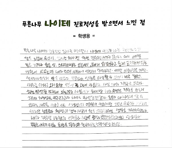 푸른나무 나이테 진로적성 검사를 받으면서 내 안의 또다른 나를 발견하는 것 같은 느낌이 들었다. 검사를 하기 전, 한번 힘들었던 시기를 겪어서 다시 어려운 길을 가거나 힘든 일, 스트레스 받는 일들에 있어서 회피하고 쉽게 포기하게되는 경향이 있었는데 내가 무엇을 위해 열심히 살아야하고, 어떤 마음가짐을 가지고 살아가야 하는지 알 수 있었다. 부모님의 성향을 파악할 수 있어서 너무 좋았고 아빠를 데리고 오지 못한 부분이 쫌 많이 아쉽다. 사실 내가 잘할 수 있을까 하는 막연한 걱정이 드는 것도 사실이다. 하지만 내가 무엇을 잘할 수 있는지, 그것의 가능성을 알고 모르고의 차이는 확실한 것 같다. 충분히 내 자신이 할 수 있다는 사실을 알았고, 또 박사님께 멘탈이 약하지만 그것을 극복한 사람이 된다면 남들보다 훨씬 더 강한 사람이 될 수 있겠구나라는 생각도 가지게 되었다. 내가 가졌던 방황과 어려운 시간을 숨기거나 부끄러워하지 않고 당당하게 목표를 이루기 위해 최선을 다하며 살아가도록 노력해야겠다.