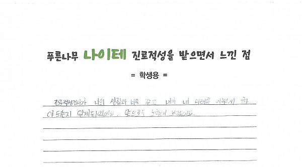 진로적성검사가 나의 성질과 너무 같고 내가 내 미래를 어떻게 해야 되는지 알게 되었어요. 앞으로도 노력해 보겠어요.