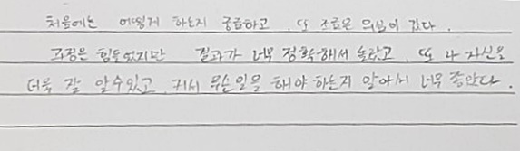 나이테 진로적성 후기(서울, 중) 페이지 정보 작성자 관리자 작성일18-07-07 11:53 조회5,506회 댓글0건 이전글 다음글 목록 본문 처음에는 어떻게 하는지 궁금하고, 또 조금은 의심이 갔다. 과정은 힘들었지만 결과가 너무 정확해서 놀랐고, 또 나 자신을 더욱 잘 알수 있고, 커서 무슨 일을 해야 하는지 알아서 너무 좋았다. 댓글목록 등록된 댓글이 없습니다. 이전글 다음글 목록