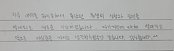 나이테 진로적성 후기(서울, 성인) 페이지 정보 작성자 관리자 작성일18-03-21 19:43 조회5,514회 댓글0건 이전글 다음글 목록 본문 (보호자) 자주 얘기를 하지 못해서 몰랐던 동생의 성향과 능력을 알게 되는 새로운 시간이었습니다. 자기자신에 대해 알아가고 앞으로 자신감을 가지고 생각할 수 있을 것 같습니다. 감사합니다.^^ 댓글목록 등록된 댓글이 없습니다. 이전글 다음글 목록