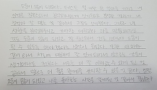 도움이 많이 되었고 나를 돌아보는 시간을 갖게 된 것 같아서 좋았다.