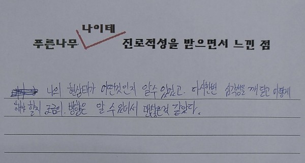 푸른나무 나이테 진로적성 후기 페이지 정보 작성자 관리자 작성일17-02-24 14:46 조회5,409회 댓글0건 이전글 다음글 목록 본문 (부모) 막연한 생각하고 있던것들이 생각이 정리가 되어 좀더 좁혀져서 선택된것에서 진로에 대해 생각해 보면 될것 같습니다. (학생) 나의 현상태가 어떤것인지 알수 있었고, 다시한번 심각성을 깨닫고 어떻게 해야할지 조금의 방향은 알 수 있어서 괜찮은 것 같았다. 댓글목록 등록된 댓글이 없습니다. 이전글 다음글 목록