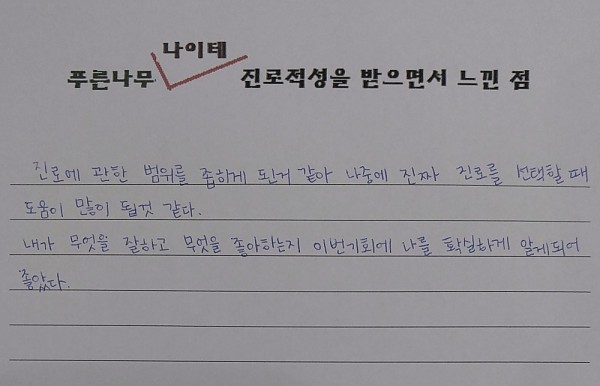 진로에 관한 범위를 좁히게 된거 같아 나중에 진짜 진로를 선택할 때 도움이 많이 될 것 같다.