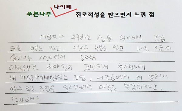 나이테 진로적성 후기 페이지 정보 작성자 관리자 작성일17-03-17 15:59 조회5,488회 댓글0건 이전글 다음글 목록 본문 내 성격과 추구하는 삶을 알게되니 공감되는 부분도 있고, 새로운 부분도 있고 나를 조금 더 알고가는 시간이여서 좋았다. 어떤 공부를 해야될지 고민되어 찾아왔는데 내가 행복하게 할 수 있는 직업, 내 전공에서 더 살려서 할 수 있는 직업을 알려주셔서 아직도 복잡하지만, 감사하다. 댓글목록 등록된 댓글이 없습니다. 이전글 다음글 목록