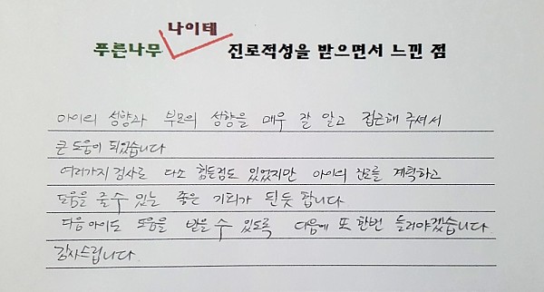 나이테 진로상담 후기 페이지 정보 작성자 관리자 작성일17-03-24 13:53 조회5,312회 댓글0건 이전글 다음글 목록 본문 아이의 성향과 부모의 성향을 매우 잘 알고 접근해 주셔서 큰 도움이 되었습니다. 여러가지 검사로 다소 힘든점도 있었지만 아이의 진로를 계획하고 도움을 줄 수 있는 좋은 기회가 된 듯 합니다. 다음아이도 도움을 받을 수 있도록 다음에 또 한번 들러야겠습니다. 감사드립니다. 댓글목록 등록된 댓글이 없습니다. 이전글 다음글 목록