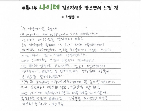 오늘 적성검사를 통해서 내 기질에 대해 알게 되어서 뜻깊은 시간이었다. 진로를 확실하게 잡을 수 있는 시간이여서 뭔가 마음이 안심되었다.