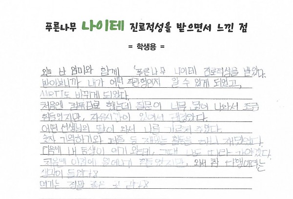 오늘 난 엄마와 함께 푸른나무 나이테 진로적성을 받았다.