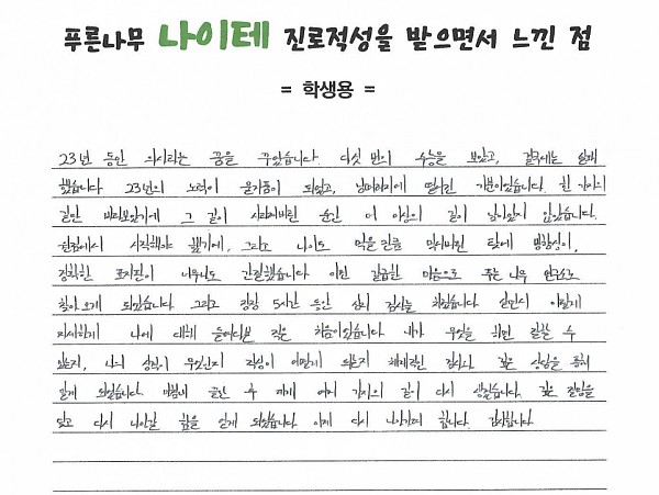 이런 갈급한 마음으로 푸른나무연구소로 찾아오게 되었습니다. 그리고 장장 5시간 동안 심리검사를 했습니다. 살면서 이렇게 자세하게 나에 대해 들여다 본 적은 처음이었습니다. 내가 무엇을 하면 잘할 수 있는지, 나의 성격이 무엇인지 적성이 어떻게 되는지 체계적인 검사와 깊은 상담을 통해 알게 되었습니다.
