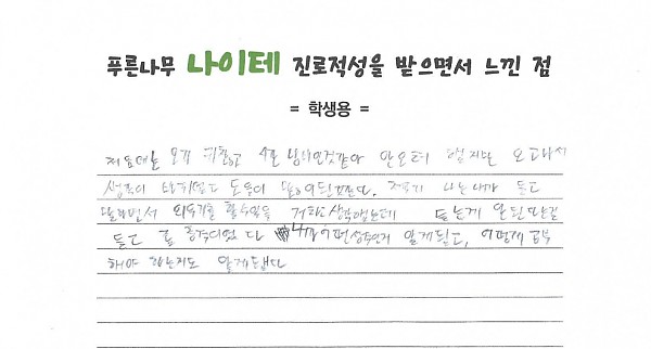 나이테 진로상담 후기(경기) 학생 페이지 정보 작성자 관리자 작성일23-12-11 11:10 조회2,846회 댓글0건 이전글 다음글 목록 본문 처음에는 오기 귀찮고 시간 낭비인 것같아 안오려 했지만 오고나서 생각이 바뀌었고 도움이 많이 된 것같다. 처음에 나는 내가 듣고 말하면서 외우기를 할 수 있을 거라고 생각했는데 듣는게 안된다는 걸 듣고 좀 충격이었다. 내가 어떤 성격인지 알게 됐고, 어떻게 공부해야 하는지도 알게 됐다. 댓글목록 등록된 댓글이 없습니다. 이전글 다음글 목록