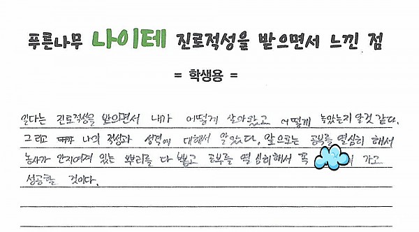 나이테 진로상담 후기(서울) 학생 페이지 정보 작성자 관리자 작성일23-05-16 20:33 조회3,297회 댓글0건 이전글 다음글 목록 본문 일다는 진로적성을 받으면서 내가 어떻게 살아왔고 어떻게 놀았는지 알 것 같다. 그리고 나의 적성과 성격에 대해서 알았다. 앞으로는 공부를 열심히 해서 농사가 안지여져 있는 뿌리를 다 뽑고 공부를 열심히 해서 꼭 @@@@ 가고 성공할 것이다. 댓글목록 등록된 댓글이 없습니다. 이전글 다음글 목록