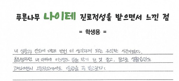 나이테 진로상담 후기(서울)학생 페이지 정보 작성자 관리자 작성일23-08-04 17:34 조회3,142회 댓글0건 이전글 다음글 목록 본문 내성향과 진로에 대해 한번 더 생각하게 되는 유익한 시간이였다. 불분명하던 내 미래에 어느 정도 길을 닦게 된 것 같고, 앞으로 생활습관도 고쳐나가면서 고등학교에서도 1등급을 꼭 받고 싶다. 댓글목록 등록된 댓글이 없습니다. 이전글 다음글 목록