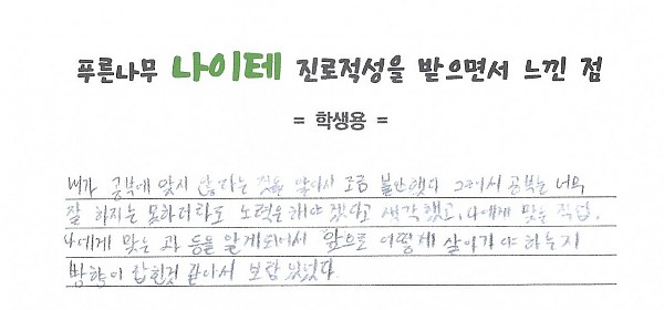 나이테 진로상담 후기(학생) 서울 페이지 정보 작성자 관리자 작성일23-08-21 14:14 조회3,179회 댓글0건 이전글 다음글 목록 본문 내가 공부에 맞지 않다는 것을 알아서 조금 불안했다. 그래서 공부는 너무 잘 하지는 못하더라도 노력은 해야겠다고 생각했고, 나에게 맞는 직업, 나에게 맞는 과 등을 알게 되어서 앞으로 어떻게 살아가야 하는지 방향이 잡힌 것 같아서 보람있었다. 댓글목록 등록된 댓글이 없습니다. 이전글 다음글 목록
