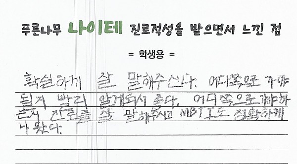 나이테 진로상담 후기(서울) 학생 페이지 정보 작성자 관리자 작성일22-08-23 20:20 조회3,662회 댓글0건 이전글 다음글 목록 본문 확실하게 잘 말해주신다. 어디쪽으로 가야 될지 빨리 알게되서 좋다. 어디 쪽으로 가야하 는지 진로를 잘 말해주시고 MBTI도 정확하게 나왔다. 댓글목록 등록된 댓글이 없습니다. 이전글 다음글 목록