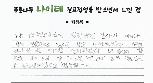 나이테 진로상담 후기(서울) 학생 페이지 정보 작성자 관리자 작성일22-11-22 20:42 조회3,638회 댓글0건 이전글 다음글 목록 본문 그냥 인터넷으로 하는 성격유형검사가 아니라 훨씬 전문적으로 검사를 받고 내 성격유형이 어떤지 다시 한번 제대로 알게 되었다. 내 특성에 맞는 직업을 갖기 위해 오늘 들은 이야기에 대해 좀 더 고민해보고 잘 결정해야겠다고 생각한다. 댓글목록 등록된 댓글이 없습니다. 이전글 다음글 목록