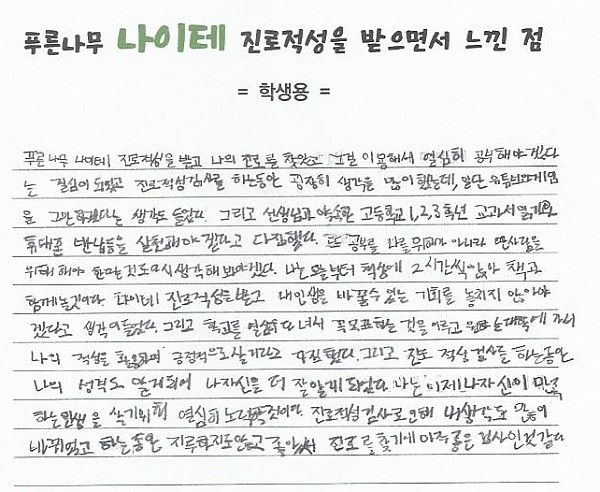 푸른나무 나이테 진로적성을 받고 나의 진로를 찾았고 그걸 이용해서 열심히 공부해야겠다