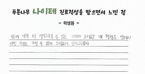 나이테 진로상담 후기(서울) 학생 페이지 정보 작성자 관리자 작성일22-05-13 14:20 조회4,048회 댓글0건 이전글 다음글 목록 본문 진로에 대해 더 생각해볼 수 있는 계기가 되었고 내 장점을 살려서 어떤 직업을 가질 수 있게 되었는지 알게되었다. 댓글목록 등록된 댓글이 없습니다. 이전글 다음글 목록
