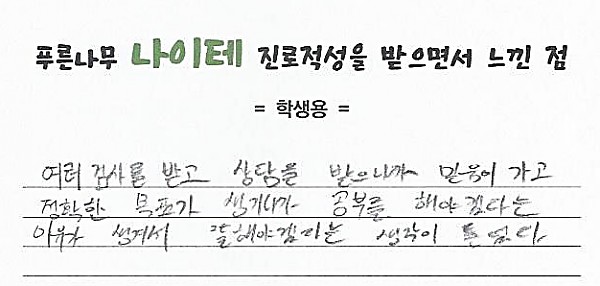 나이테 진로상담 후기(서울) 학생 페이지 정보 작성자 관리자 작성일22-05-13 14:21 조회3,957회 댓글0건 이전글 다음글 목록 본문 여러 검사를 받고 상담을 받으니까 믿음이 가고 정확한 목표가 생기니까 공부를 해야겠다는 이유가 생겨서 잘 해야겠다는 생각이 들었다. 댓글목록 등록된 댓글이 없습니다. 이전글 다음글 목록