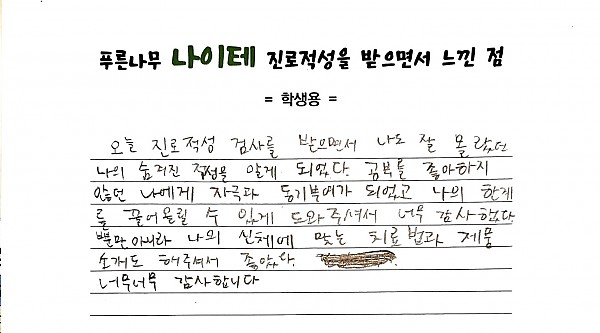 오늘 진로적성 검사를 받으면서 나도 잘 몰랐던 나의 숨겨진 적성을 알게 되었다. 공부를 좋아하지 않던 나에게 자극과 동기부여가 되었고 나의 한계를 끌어올릴 수 있게 도와주셔서 너무 감사했다. 뿐만 아니라 나의 신체에 맞는 치료법과 제품 소개도 해주셔서 좋았다. 너무너무 감사합니다.