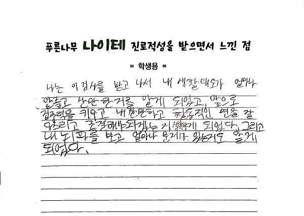 나는 이 검사를 받고 나서 내 생활태도가 얼마나 안 좋고 산만한 지를 알게 되었고, 앞으로 집중력을 키우고 내 산만하고 활동적인 면을 잘 다스리고 조절해야 되겠는지 생각하게 되었다. 그리고 내 뇌파를 보고 얼마나 문제가 있는지도 알게 되었다.